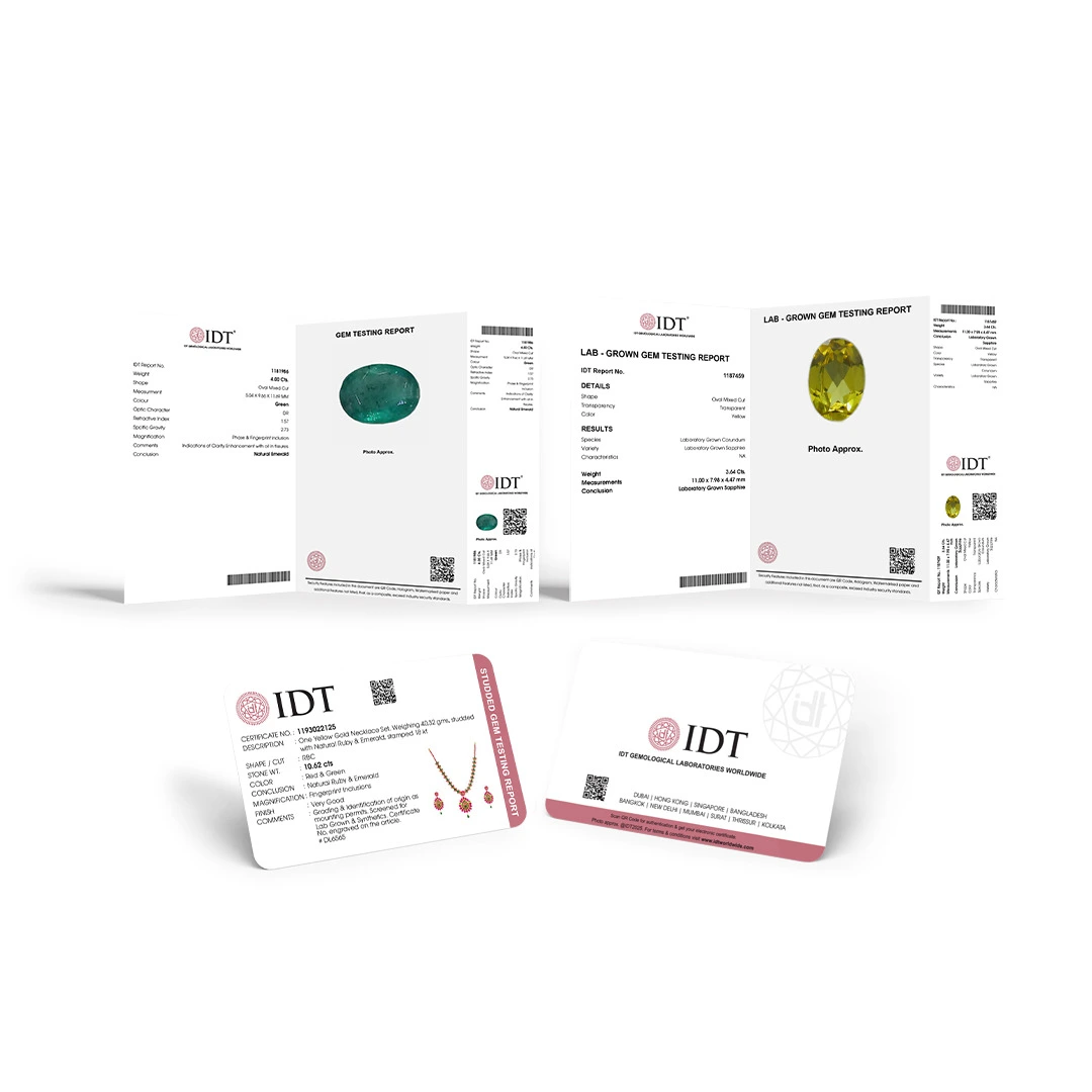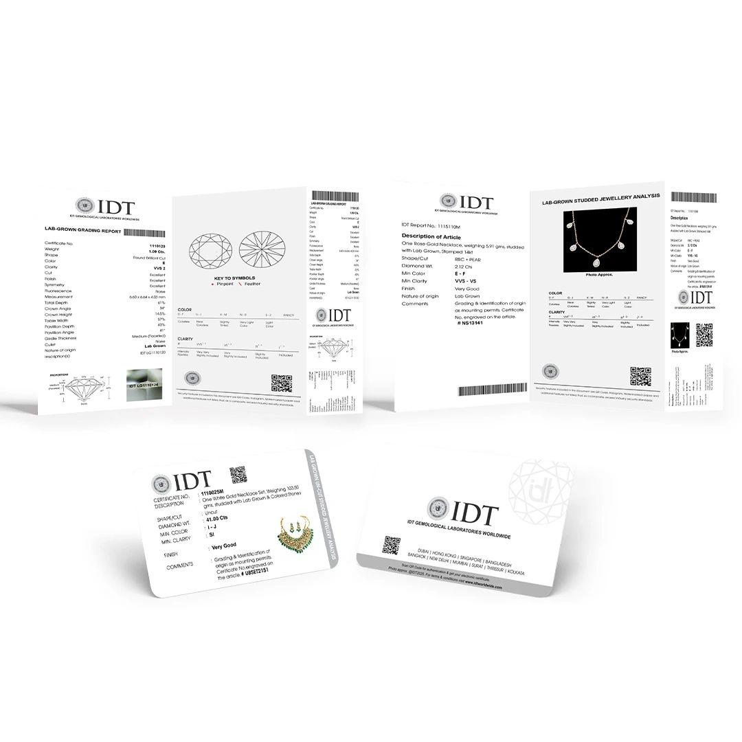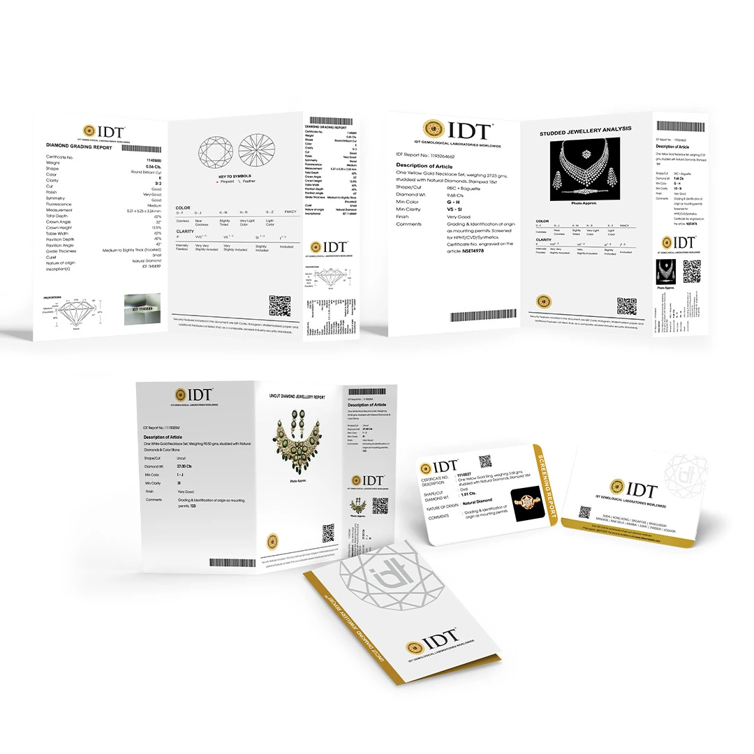 The IDT Screening Report confirms whether a loose diamond or a diamond in jewellery is a Natural Diamond. Using advanced detection and spectroscopic tools, the report verifies origin without offering full grading. It includes basic details such as shape and estimated weight (for mounted pieces) along with a clear confirmation of natural identity. This certificate is ideal for quick, reliable origin assurance for both trade and retail.